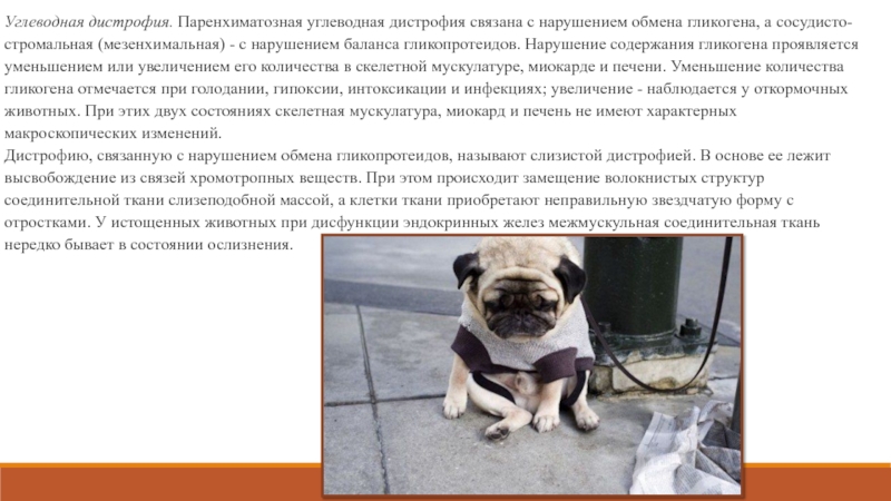 Слайд 10Углеводная дистрофия. Паренхиматозная углеводная дистрофия связана с нарушением обмена гликогена,