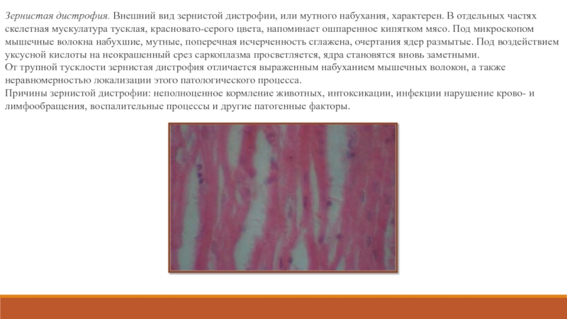 Слайд 5Зернистая дистрофия. Внешний вид зернистой дистрофии, или мутного набухания, характерен.