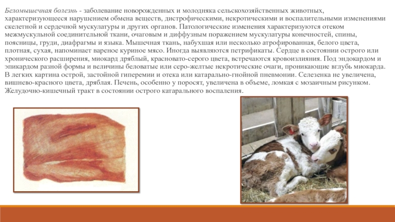Слайд 39Беломышечная болезнь - заболевание новорожденных и молодняка сельскохозяйственных животных, характеризующееся