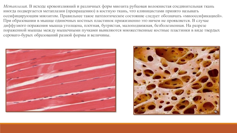 Слайд 25Метаплазия. В исходе кровоизлияний и различных форм миозита рубцовая волокнистая