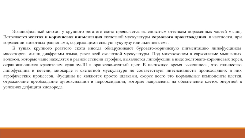 Слайд 15Эозинофильный миозит у крупного рогатого скота проявляется зеленоватым оттенком пораженных
