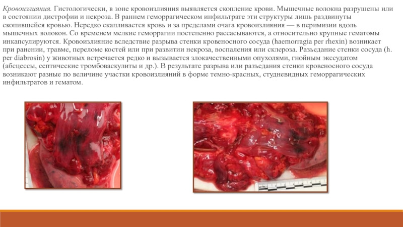 Слайд 21Кровоизлияния. Гистологически, в зоне кровоизлияния выявляется скопление крови. Мышечные волокна