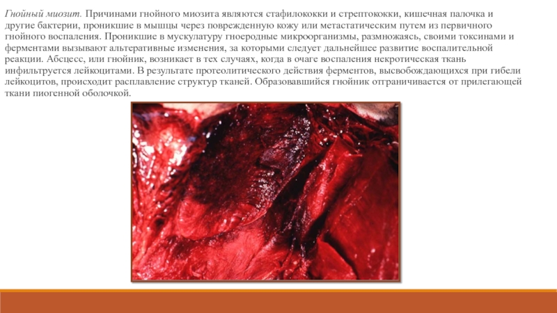 Слайд 28Гнойный миозит. Причинами гнойного миозита являются стафилококки и стрептококки, кишечная