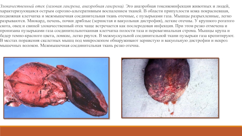 Слайд 32Злокачественный отек (газовая гангрена, анаэробная гангрена). Это анаэробная токсикоинфекция животных