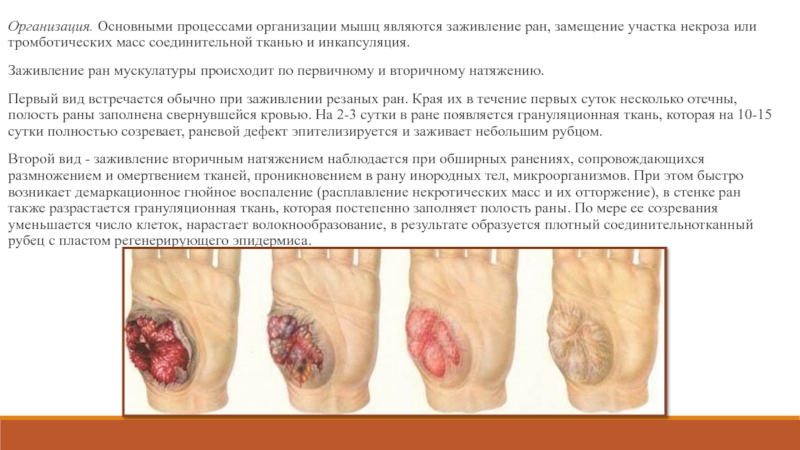 Слайд 26Организация. Основными процессами организации мышц являются заживление ран, замещение участка