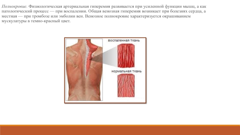 Слайд 19Полнокровие. Физиологическая артериальная гиперемия развивается при усиленной функции мышц, а