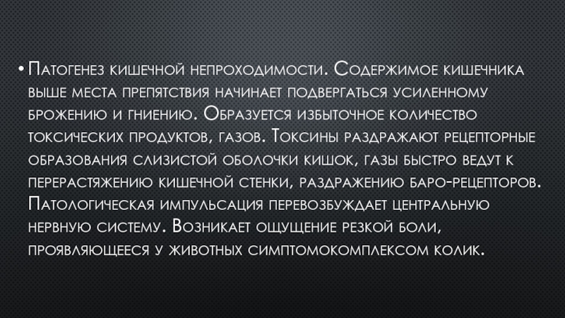 Слайд 61Патогенез кишечной непроходимости. Содержимое кишечника выше места препятствия начинает подвергаться