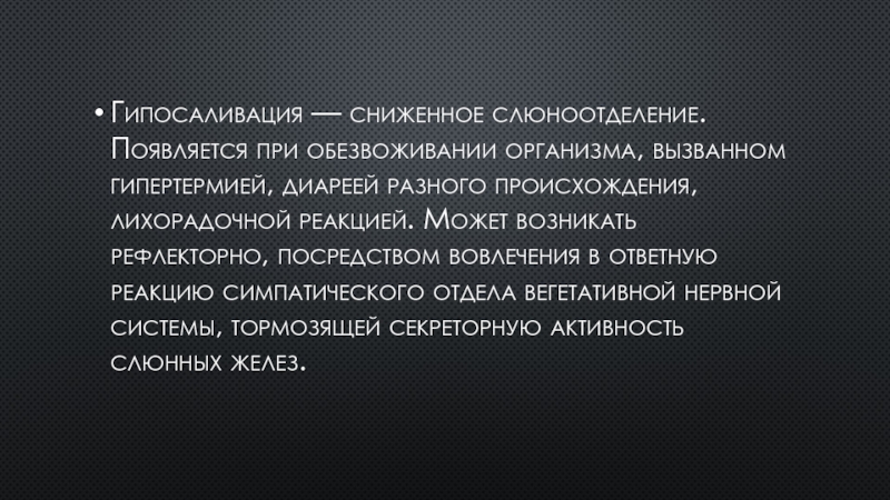 Слайд 18Гипосаливация — сниженное слюноотделение. Появляется при обезвоживании организма, вызванном гипертермией,