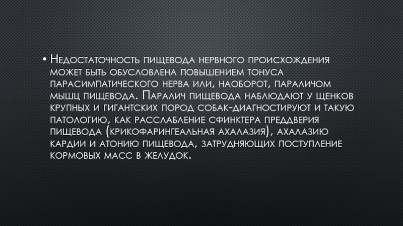 щенков крупных и гигантских пород собак-диагностируют и такую патологию, как расслабление сфинктера преддверия пищевода (крикофарингеальная ахалазия), ахалазию кардии и атонию пищевода, затрудняющих поступление кормовых масс в желудок.