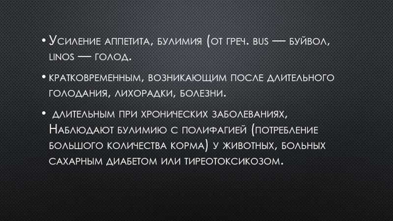 Слайд 3Усиление аппетита, булимия (от греч. bus — буйвол, linos —