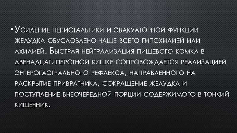более длительно нейтрализуется и, таким образом, тормозится рефлекторное раскрытие желудочного сфинктера. Эвакуация химуса в двенадцатиперстную кишку задерживается.