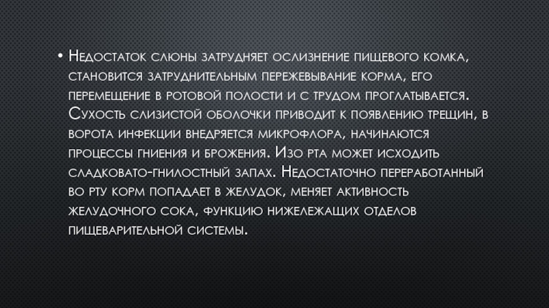 Слайд 19Недостаток слюны затрудняет ослизнение пищевого комка, становится затруднительным пережевывание корма,