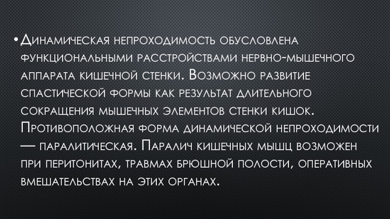 Слайд 58Динамическая непроходимость обусловлена функциональными расстройствами нервно-мышечного аппарата кишечной стенки. Возможно