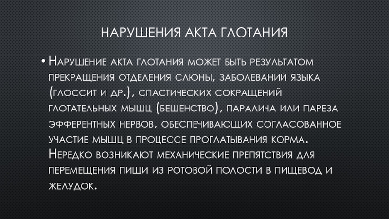 (бешенство), паралича или пареза эфферентных нервов, обеспечивающих согласованное участие мышц в процессе проглатывания корма. Нередко возникают механические препятствия для перемещения пищи из ротовой полости в пищевод и желудок.