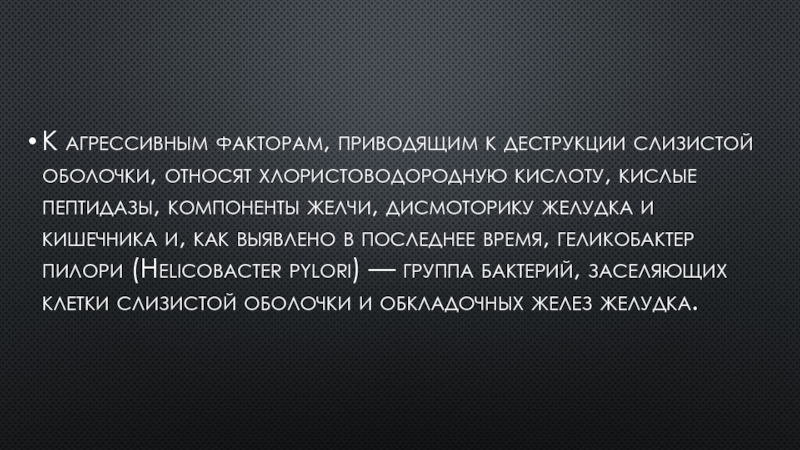 Слайд 42К агрессивным факторам, приводящим к деструкции слизистой оболочки, относят хлористоводородную