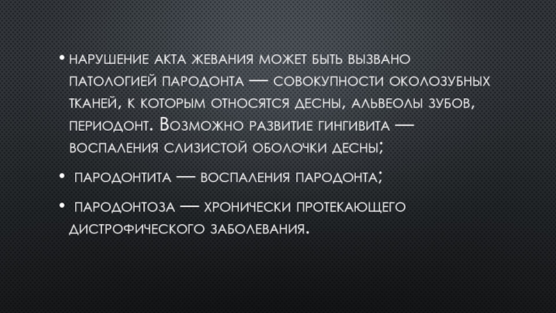 Слайд 10нарушение акта жевания может быть вызвано патологией пародонта — совокупности