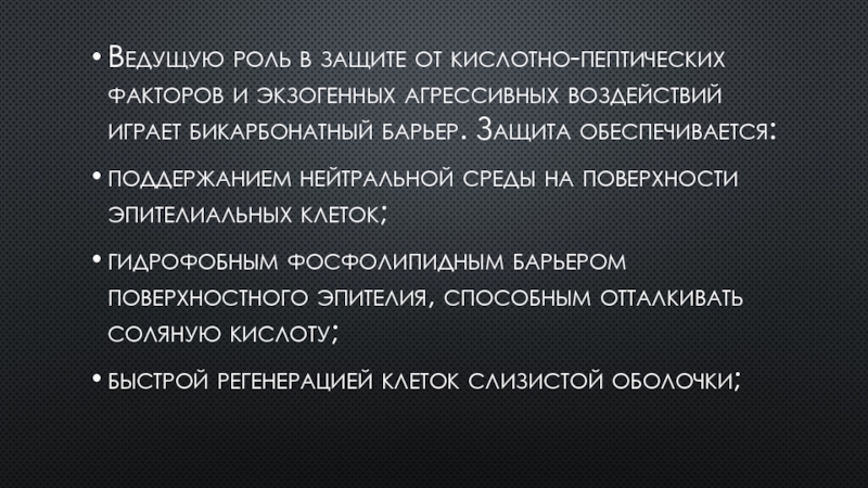 Слайд 40Ведущую роль в защите от кислотно-пептических факторов и экзогенных агрессивных