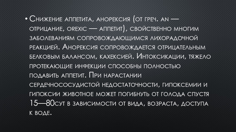 белковым балансом, кахексией. Интоксикации, тяжело протекающие инфекции способны полностью подавить аппетит. При нарастании сердечнососудистой недостаточности, гипоксемии и гипоксии животное может погибнуть от голода спустя 15—80сут в зависимости от вида, возраста, доступа к воде.