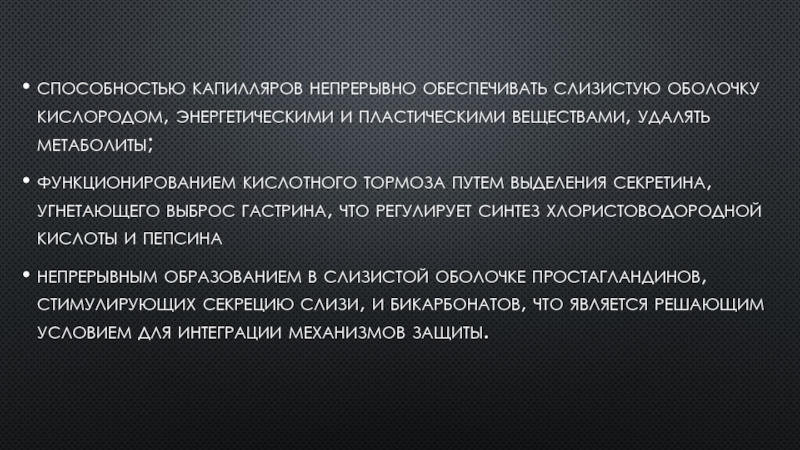 непрерывным образованием в слизистой оболочке простагландинов, стимулирующих секрецию слизи, и бикарбонатов, что является решающим условием для интеграции механизмов защиты.