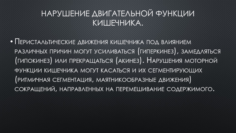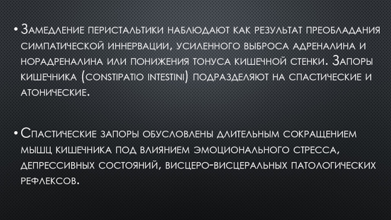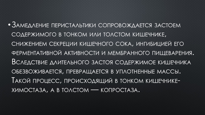 Слайд 56Замедление перистальтики сопровождается застоем содержимого в тонком или толстом кишечнике,