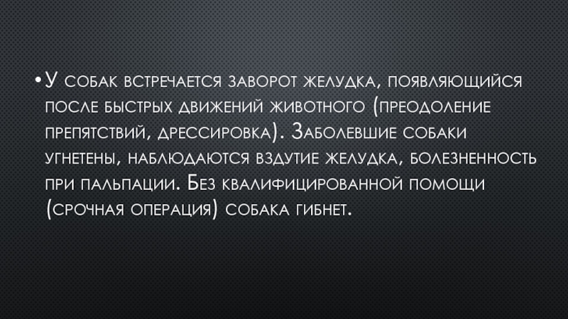 Слайд 38У собак встречается заворот желудка, появляющийся после быстрых движений животного