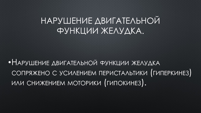 Слайд 37Снижение двигательной активности и эвакуаторной способности -повышенная кислотность желудочного сока.