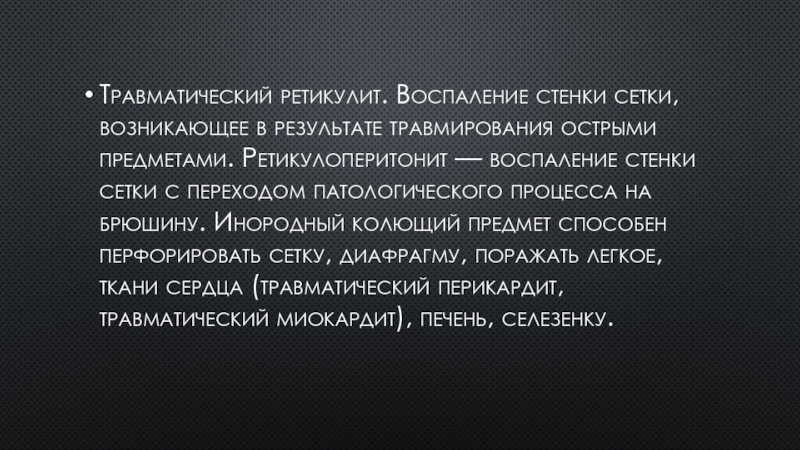 Слайд 28Травматический ретикулит. Воспаление стенки сетки, возникающее в результате травмирования острыми