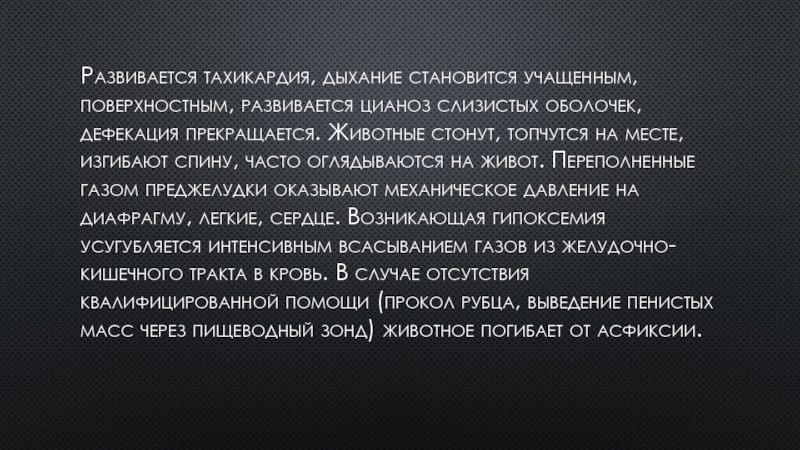 оглядываются на живот. Переполненные газом преджелудки оказывают механическое давление на диафрагму, легкие, сердце. Возникающая гипоксемия усугубляется интенсивным всасыванием газов из желудочно-кишечного тракта в кровь. В случае отсутствия квалифицированной помощи (прокол рубца, выведение пенистых масс через пищеводный зонд) животное погибает от асфиксии.