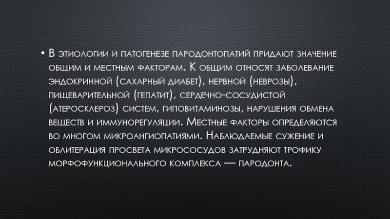 Слайд 11В этиологии и патогенезе пародонтопатий придают значение общим и местным