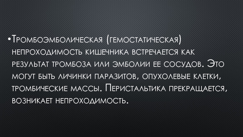 Слайд 60Тромбоэмболическая (гемостатическая) непроходимость кишечника встречается как результат тромбоза или эмболии