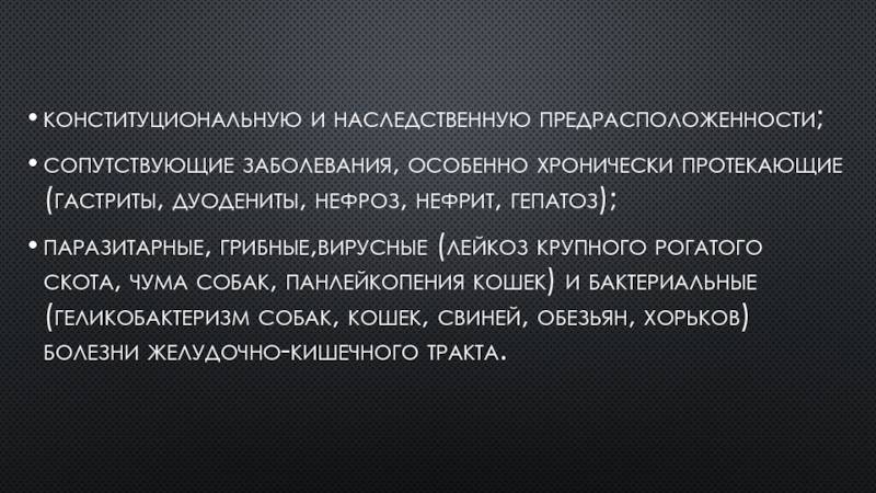 панлейкопения кошек) и бактериальные (геликобактеризм собак, кошек, свиней, обезьян, хорьков) болезни желудочно-кишечного тракта.