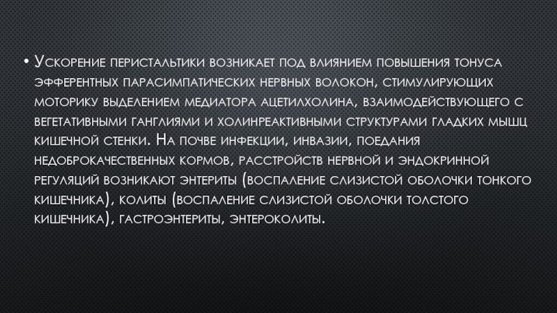 и холинреактивными структурами гладких мышц кишечной стенки. На почве инфекции, инвазии, поедания недоброкачественных кормов, расстройств нервной и эндокринной регуляций возникают энтериты (воспаление слизистой оболочки тонкого кишечника), колиты (воспаление слизистой оболочки толстого кишечника), гастроэнтериты, энтероколиты.