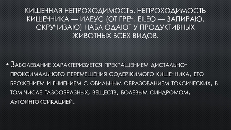 Слайд 57Кишечная непроходимость. Непроходимость кишечника — илеус (от греч. eileo —