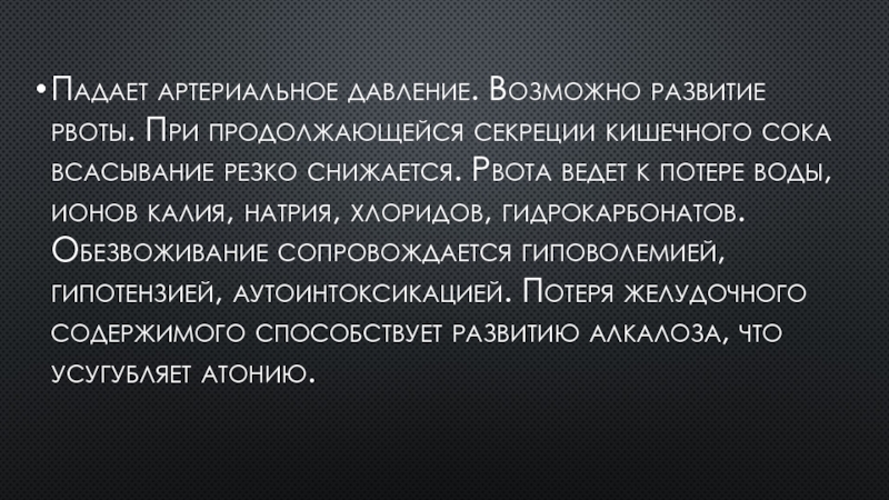Слайд 62Падает артериальное давление. Возможно развитие рвоты. При продолжающейся секреции кишечного