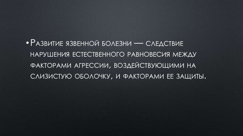 Слайд 43Развитие язвенной болезни — следствие нарушения естественного равновесия между факторами