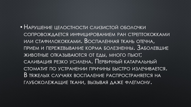 слизистой оболочки приводит к появлению трещин, в ворота инфекции внедряется микрофлора, начинаются процессы гниения и брожения. Изо рта может исходить сладковато-гнилостный запах. Недостаточно переработанный во рту корм попадает в желудок, меняет активность желудочного сока, функцию нижележащих отделов пищеварительной системы.
