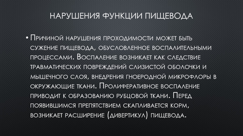 и мышечного слоя, внедрения гноеродной микрофлоры в окружающие ткани. Пролиферативное воспаление приводит к образованию рубцовой ткани. Перед появившимся препятствием скапливается корм, возникает расширение (дивертикул) пищевода.