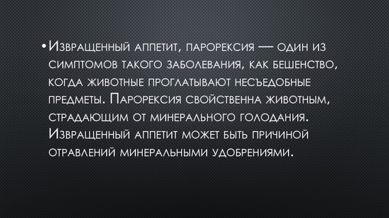 бешенство, когда животные проглатывают несъедобные предметы. Парорексия свойственна животным, страдающим