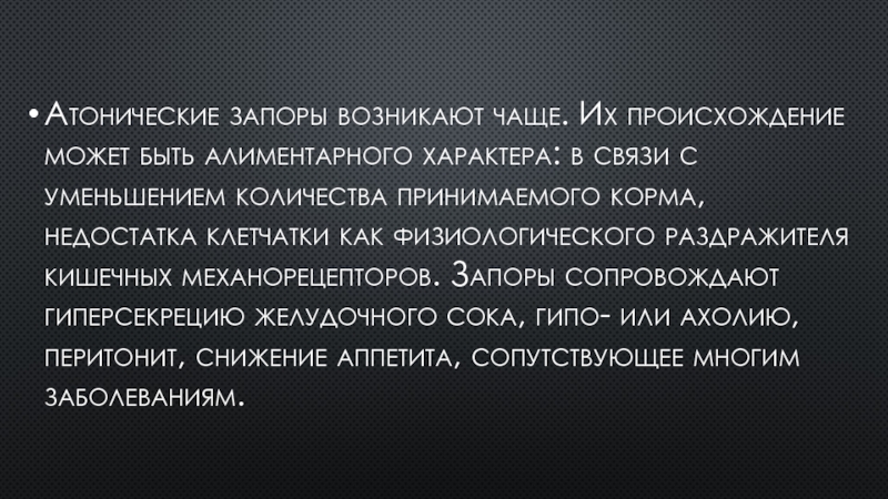 Слайд 55Атонические запоры возникают чаще. Их происхождение может быть алиментарного характера: