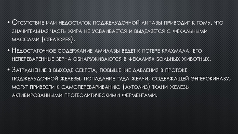 Слайд 48Отсутствие или недостаток поджелудочной липазы приводит к тому, что значительная