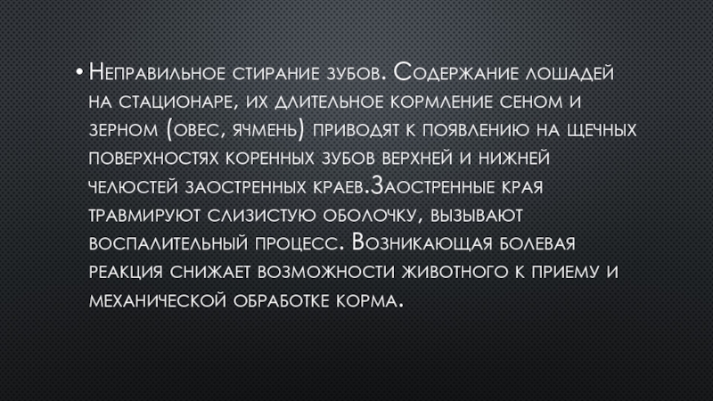 Слайд 9Неправильное стирание зубов. Содержание лошадей на стационаре, их длительное кормление
