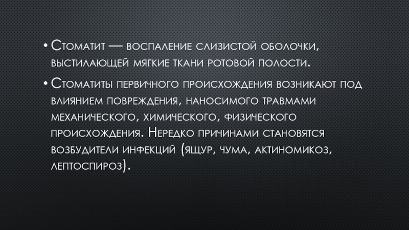 Слайд 13Стоматит — воспаление слизистой оболочки, выстилающей мягкие ткани ротовой полости.