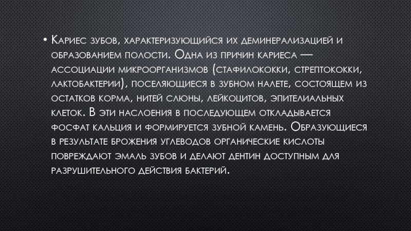 зубном налете, состоящем из остатков корма, нитей слюны, лейкоцитов, эпителиальных клеток. В эти наслоения в последующем откладывается фосфат кальция и формируется зубной камень. Образующиеся в результате брожения углеводов органические кислоты повреждают эмаль зубов и делают дентин доступным для разрушительного действия бактерий.