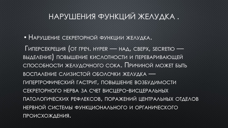 переваривающей способности желудочного сока. Причиной может быть воспаление слизистой оболочки желудка — гипертрофический гастрит, повышение возбудимости секреторного нерва за счет висцеро-висцеральных патологических рефлексов, поражений центральных отделов нервной системы функционального и органического происхождения.