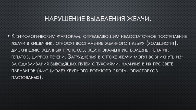 желчнокаменную болезнь, гепатит, гепатоз, цирроз печени. Затруднения в оттоке желчи могут возникнуть из-за сдавливания выводящих путей опухолями, наличия в их просвете паразитов (фисциолез крупного рогатого скота, описторхоз плотоядных).
