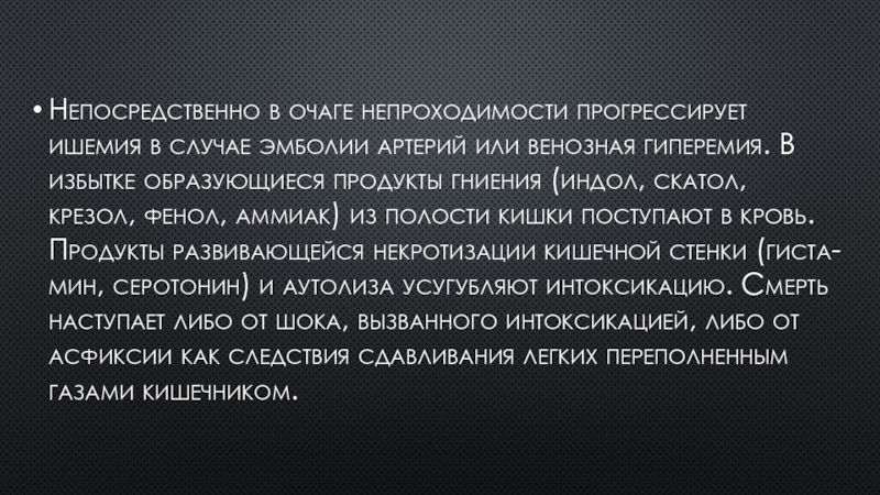 крезол, фенол, аммиак) из полости кишки поступают в кровь. Продукты развивающейся некротизации кишечной стенки (гиста-мин, серотонин) и аутолиза усугубляют интоксикацию. Смерть наступает либо от шока, вызванного интоксикацией, либо от асфиксии как следствия сдавливания легких переполненным газами кишечником.
