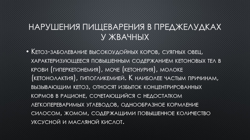 молоке (кетонолактия), гипогликемией. К наиболее частым причинам, вызывающим кетоз, относят избыток концентрированных кормов в рационе, сочетающийся с недостатком легкопереваримых углеводов, однообразное кормление силосом, жомом, содержащими повышенное количество уксусной и масляной кислот.