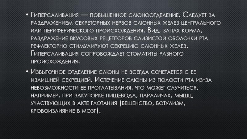 Слайд 16Гиперсаливация — повышенное слюноотделение. Следует за раздражением секреторных нервов слюнных