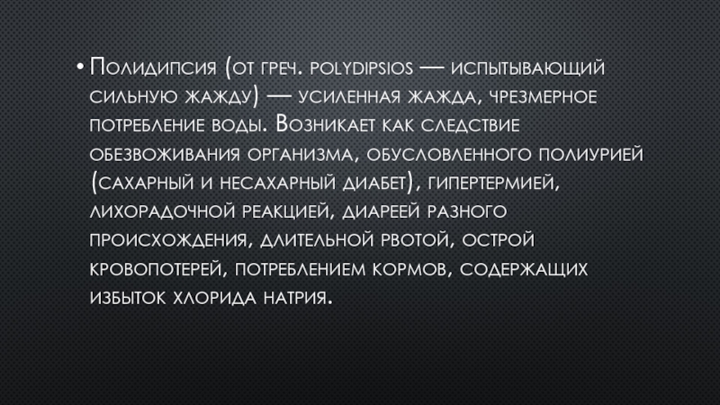Слайд 6Полидипсия (от греч. polydipsios — испытывающий сильную жажду) — усиленная