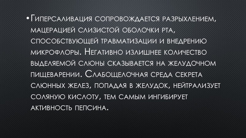 Слайд 17Гиперсаливация сопровождается разрыхлением, мацерацией слизистой оболочки рта, способствующей травматизации и